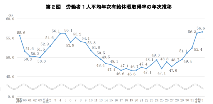 法的な義務付けもあり、有給休暇の取得率56.6%と1984年(昭和59年)以降で過去最高となりました。