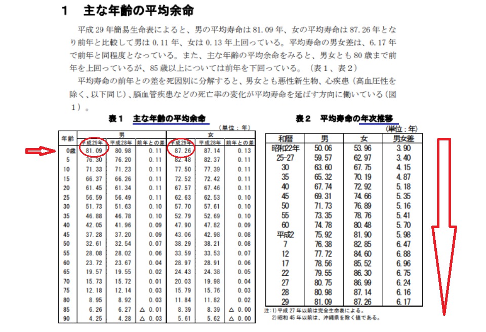 下図の右側にある表2平均寿命の年次推移を見てください。